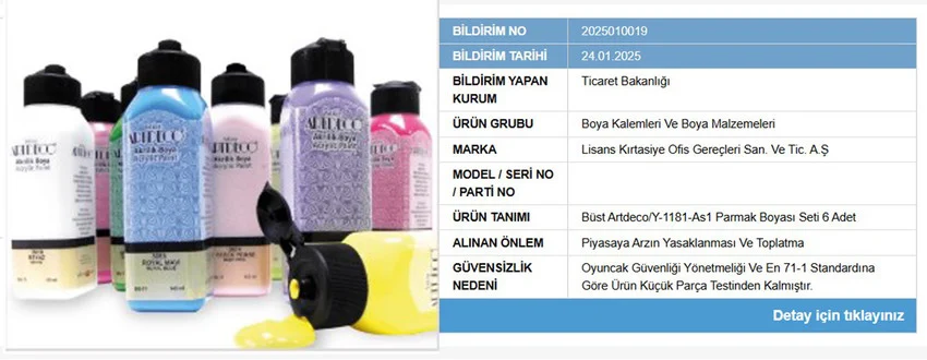 Ticaret Bakanlığı tarafından yapılan açıklamaya göre, Lisans Kırtasiye Ofis Gereçleri San. ve Tic. A.Ş.’nin piyasaya sunduğu “Büst Artdeco/Y-1181-As1 Parmak Boyası Seti 6 Adet” adlı ürünün satışı yasaklandı. Çocuklar için risk taşıyan parmak boyası seti, piyasadan toplatılmaya başlandı.