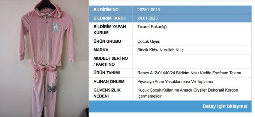 Biricik Kids markasına ait “Rapex A12/01440/24 Bildirim Nolu Kadife Eşofman Takımı”nda ise, kordonun tehlike oluşturduğu belirlendi. Bu eşofman takımının satışı da yasaklanarak, tüm ürünler piyasadan geri toplanacak.